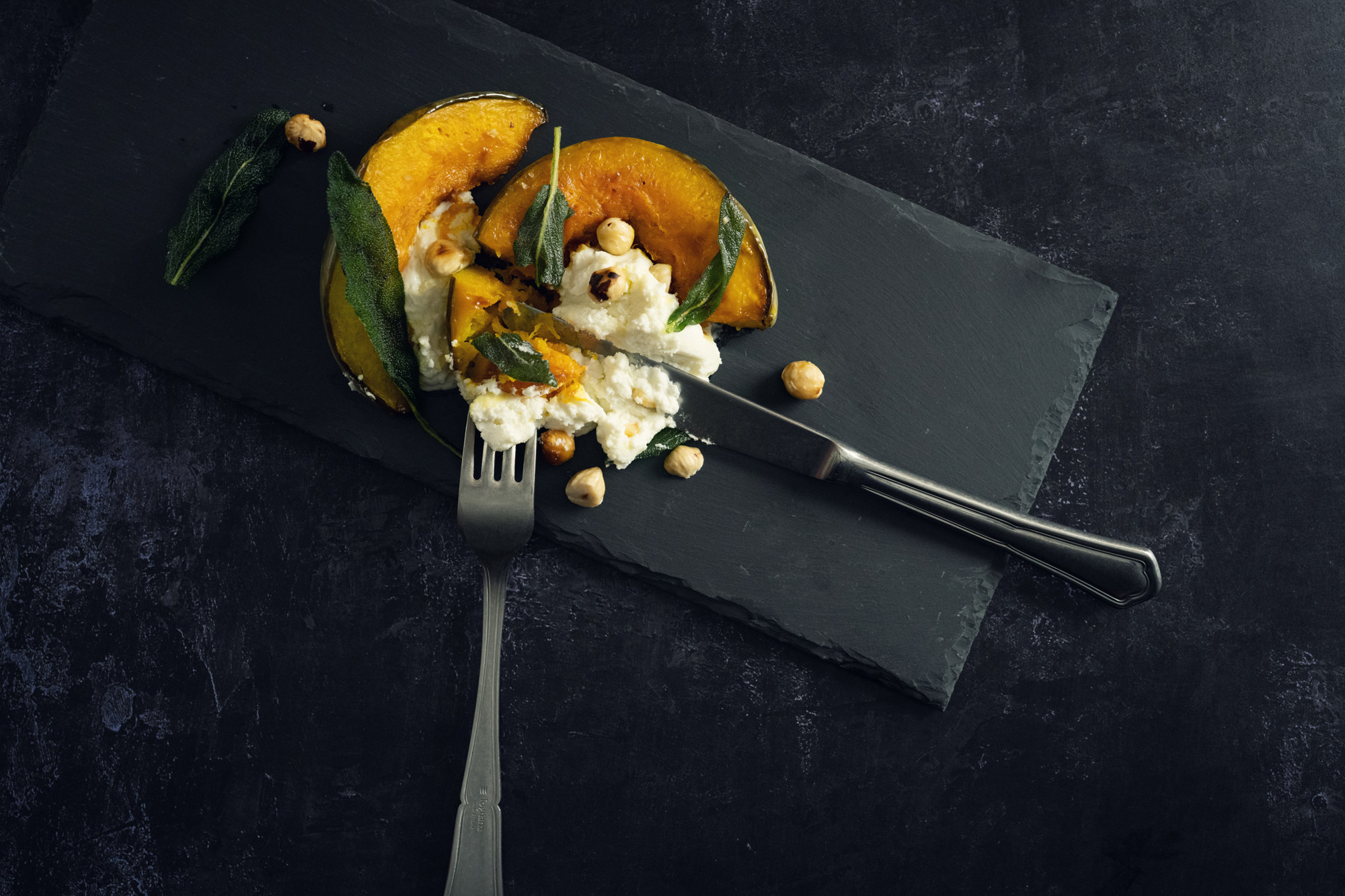 Something big to watch out for, however, are reflections. “If you don’t pay attention, it can be a nightmare,” Kate exclaims, “as they bring harsh and ugly contrast to a shot, drawing the eye away from the food. To deal with that, we use softening modifiers like softboxes, but also pick out cutlery and plates that are matte or have a rich patina. You certainly don’t want to be adjusting light position based on reflections – only what’s best for the subject. If all else fails you can get mattifying sprays to take the glare off, but just don’t eat anything after that’s been on it!”