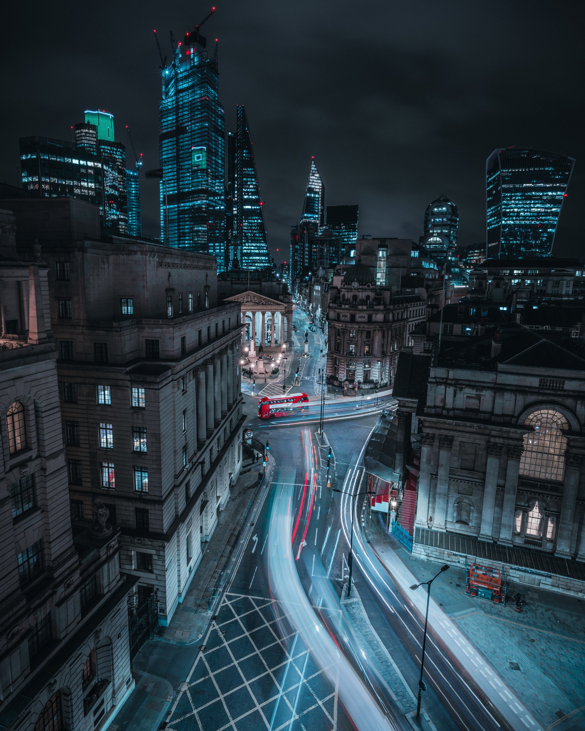 Movement is also an important ingredient, but not just any type. Long exposures in low-light naturally leads to motion blur and light trails, but, says Mike, you need to work a bit harder again. Combining static elements with the blur is one method he uses, such as the focal point of the static bus in the middle of his Bank shot, or using a still human shape to contrast with the motion.